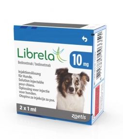 ЛібрелаЯКІСНИЙ І КІЛЬКІЙ СКЛАДКожен флакон обємом 1 мл містить:бідінветмаб:5 мг10 мг15 мг20 мг30 мг собачі моноклональні антитіла, експресовані рекомбінантними методами в яєчнях китайського хомячка.ЛІКОВА ФОРМАРозчин для інєкцій.Від прозорого до злегка опалювального розчину.КЛІНІЧНІ ОСОБЛИВОСТІЦільові типи собаки.Показання для застосування із зазначенням цільових видів для полегшення болю, повязаного з остеоартритом у собак.Протипоказання - не використовуйте при підвищеній чутливості до активної речовини або будь-якої допоміжної речовини.Не застосовувати у собак віком до 12 місяців.Не застосовувати тваринам, призначеним для розведення.Не застосовувати вагітним або тваринам, що годують.Особливі запобіжні заходи при використанні:-Особі, яка вводить ветеринарний лікарський препарат, повинна вживати спеціальні запобіжні заходи.-Реакції гіперчутливості, включаючи анафілаксію, можуть потенційно виникнути у разі випадкової інєкції. Повторне самостійне застосування може збільшити ризик реакцій гіперчутливості.-Важливість фактора росту нервів у забезпеченні нормального розвитку нервової системи плода є дуже високою. -У разі випадкового самостійного уколу негайно зверніться до лікаря та покажіть лист-вкладиш або етикетку.Побічні реакції (частота та серйозний):У поодиноких випадках можуть спостерігатися легкі реакції в місці інєкції (наприклад, набряк та підвищення місцевої температури).Частота побічних реакцій визначається за наступною умовою:- дуже часто (більше 1 з 10 пролікованих тварин проявляються побічні реакції)- звичайні (більше 1, але менше 10 тварин на 100 оброблених тварин) - нечасто (більше1, але менше 10 тварин на 1000 обробленихтварин0 рідко (менше однієї тварини з 10000 оброблених тварин, включаючи поодинокі повідомлення).Використання під час вагітності, годування груддю або яйцеклітини:-не застосовувати вагітним або тваринам, що годують.Взаємодія з іншими лікарськими засобами та інші форми взаємодії:-У лабораторних дослідженнях протягом 2-тижневого періоду у молодих здорових собак без остеоартриту препарат не чинив побічної дії при одночасному застосуванні з нестероїдним протизапальним препаратом (карпрофеном).- Немає даних про безпеку одночасного тривалого застосування нестероїдних протизапальних засобів та біноветмабу у собак.- Жодних взаємодій не спостерігалося у польових дослідженнях, де цей ветеринарний препарат застосовувався одночасно з паразитицидами, протимікробними препаратами, місцевими антисептами, антигістамінними препаратами та вакцинами.Кількість та спосіб введення:-підшкірне використання.Режим дозування та лікування:Рекомендована доза становить 0,5-1,0 мгкг маси тіла один раз на місяць.LIBRELA кількість (мг) для введенняМаса тіла (кг) собаки5101520305.0-10.01 флакон10.1-20.01 флакон20,1-30,01 флакон30,1-40,01 флакон40,1-60,01 флакон60,1-80,02 флакони80,1-100,01 флакон1 флакон100,1-120,002 флакониПередозування (симптоми, дії в екстрених випадках, антидоти за потреби):Жодних побічних реакцій, за винятком легких реакцій у місці інєкції, у лабораторії не спостерігалося.-При появі несприятливих клінічних проявів після передозування необхідно провести симптоматичне лікування собаки.ІМУНОЛОГІЧНІ ВЛАСТИВОСТІ.Фармакотерапевтична група інші анальгетики та жарознижувальні засоби.Механізм діїБідіветмаб є собачим моноклональним ант