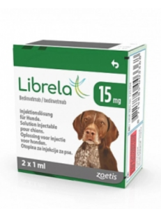 ЛібрелаЯКІСНИЙ І КІЛЬКІЙ СКЛАДКожен флакон обємом 1 мл містить:бідінветмаб:5 мг10 мг15 мг20 мг30 мг собачі моноклональні антитіла, експресовані рекомбінантними методами в яєчнях китайського хомячка.ЛІКОВА ФОРМАРозчин для інєкцій.Від прозорого до злегка опалювального розчину.КЛІНІЧНІ ОСОБЛИВОСТІЦільові типи собаки.Показання для застосування із зазначенням цільових видів для полегшення болю, повязаного з остеоартритом у собак.Протипоказання - не використовуйте при підвищеній чутливості до активної речовини або будь-якої допоміжної речовини.Не застосовувати у собак віком до 12 місяців.Не застосовувати тваринам, призначеним для розведення.Не застосовувати вагітним або тваринам, що годують.Особливі запобіжні заходи при використанні:-Особі, яка вводить ветеринарний лікарський препарат, повинна вживати спеціальні запобіжні заходи.-Реакції гіперчутливості, включаючи анафілаксію, можуть потенційно виникнути у разі випадкової інєкції. Повторне самостійне застосування може збільшити ризик реакцій гіперчутливості.-Важливість фактора росту нервів у забезпеченні нормального розвитку нервової системи плода є дуже високою. -У разі випадкового самостійного уколу негайно зверніться до лікаря та покажіть лист-вкладиш або етикетку.Побічні реакції (частота та серйозний):У поодиноких випадках можуть спостерігатися легкі реакції в місці інєкції (наприклад, набряк та підвищення місцевої температури).Частота побічних реакцій визначається за наступною умовою:- дуже часто (більше 1 з 10 пролікованих тварин проявляються побічні реакції)- звичайні (більше 1, але менше 10 тварин на 100 оброблених тварин) - нечасто (більше1, але менше 10 тварин на 1000 обробленихтварин0 рідко (менше однієї тварини з 10000 оброблених тварин, включаючи поодинокі повідомлення).Використання під час вагітності, годування груддю або яйцеклітини:-не застосовувати вагітним або тваринам, що годують.Взаємодія з іншими лікарськими засобами та інші форми взаємодії:-У лабораторних дослідженнях протягом 2-тижневого періоду у молодих здорових собак без остеоартриту препарат не чинив побічної дії при одночасному застосуванні з нестероїдним протизапальним препаратом (карпрофеном).- Немає даних про безпеку одночасного тривалого застосування нестероїдних протизапальних засобів та біноветмабу у собак.- Жодних взаємодій не спостерігалося у польових дослідженнях, де цей ветеринарний препарат застосовувався одночасно з паразитицидами, протимікробними препаратами, місцевими антисептами, антигістамінними препаратами та вакцинами.Кількість та спосіб введення:-підшкірне використання.Режим дозування та лікування:Рекомендована доза становить 0,5-1,0 мгкг маси тіла один раз на місяць.LIBRELA кількість (мг) для введенняМаса тіла (кг) собаки5101520305.0-10.01 флакон10.1-20.01 флакон20,1-30,01 флакон30,1-40,01 флакон40,1-60,01 флакон60,1-80,02 флакони80,1-100,01 флакон1 флакон100,1-120,002 флакониПередозування (симптоми, дії в екстрених випадках, антидоти за потреби):Жодних побічних реакцій, за винятком легких реакцій у місці інєкції, у лабораторії не спостерігалося.-При появі несприятливих клінічних проявів після передозування необхідно провести симптоматичне лікування собаки.ІМУНОЛОГІЧНІ ВЛАСТИВОСТІ.Фармакотерапевтична група інші анальгетики та жарознижувальні засоби.Механізм діїБідіветмаб є собачим моноклональним ант