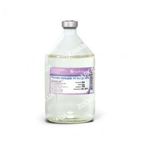 Розчин кальцію хлориду 10 - препарат, до складу якого входять кальцію хлорид, вода для інєкцій. Являє собою прозору безбарвну рідину, pH 5,5-7,0. Випускають розфасованим в скляні ампули по 10 мл або по 200, 250, 400, 450, 500 мл у споживчу тару для інєкційних лікарських засобів.Застосування:Розчин кальцію хлориду 10 застосовують як протизапальний засіб при пневмонії, плевриті, перитоніті, токсичних ураженнях печінки, паренхиматозном гепатиті, нефриті при променевій хворобі, токсичному набряку легень, гіперемії і набряку легень, набряку гортані, набрякової хвороби поросят, кровоспинний засіб при носових, шлунково-кишкових, легеневих, маткових і післяопераційних кровотечах - десенсибилизирующего засіб при алергічних захворюваннях (астма, сироваткова хвороба, шкірний свербіж, кровепятнистая хвороба коней, хронічна кропивянка у коней і великої рогатої худоби) та алергічних ускладненнях після застосування лікарських засобів - заспокійливого і нормалізує нервову систему засіб при вегетативних неврозах, еклампсії у собак, ацетонемії у корів, паралітичної міоглобінурії у коней. Препарат застосовують в акушерсько-гінекологічній практиці, при ендометритах, метритах, для стимуляції пологової діяльності, прискорення відділення затримався посліду у тварин, попередження абортів, при пологовому парезі, післяпологовий гематурії у корів.Максимальні разові дози (в мл на одну тварину):велика рогата худоба - 150-400, коні - 100-300, дрібна рогата худоба - 10-30, свині - 10-20, собаки - 5-15. Обсяг дози та строки застосування залежать від маси тварини та перебігу хвороби. Розчин кольция хлориду 10 у рекомендованих дозах не викликає у тварин побічної дії та ускладнень.Умови зберігання:Зберігаютьу сухому місці при температурі від 0 до 25 С. Термін придатності:10 років з дня виготовлення.Як купити Кальцію хлориду Розчин 10 200млОформити замовлення через корзинуОформити замовлення по контактним телефонам