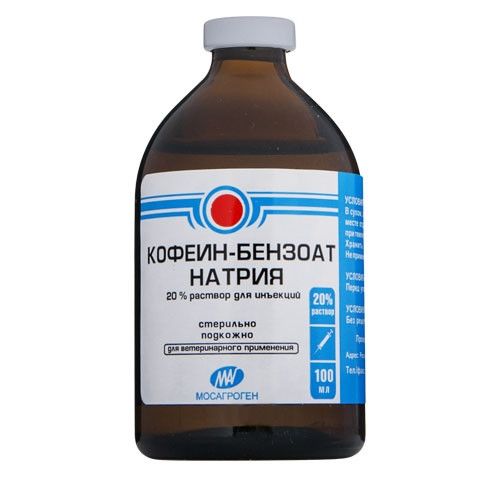 Стерильний, прозорий, безбарвний розчин для інєкцій.Склад1 мл препарату містить діючі речовини (мг):кофеїн 87,4натрію бензоат 112,6.Допоміжні речовини: вода апирогенная.Фармакологічні властивостіПрепарат збуджує центральну нервову систему тварин, активізує кровообіг, сечовиділення, стимулює роботу дихальних органів, підвищує працездатність скелетних мязів.ДозуванняПідшкірно в дозах (мл) на тварину:коні, велика рогата худоба 1025свині, вівці, кози 27собаки 0,51,5коти 0,20,5.При застосуванні перорально зазначені дози препарату збільшують у 2 рази.При необхідності допускається введення препарату 23 рази з інтервалом в 7 годин.ПротипоказанняПідвищена збудливість, вади серцево-судинної системи.ЗастереженняПрепарат несумісний з - і -адреноміметиками, анксиолітиками, інгібіторами МОНОАМІНООКСИДАЗИ, похідними ксантину, психостимулирующими речовинами, снодійними і седативними засобами.Форма випускуСкляні ампули по 5, 10, 20 мл або скляні флакони з гумової корком під алюмінієву обкатку по 20, 50 і 100 млЗберіганняСухе, темне місце при температурі від 4 до 25 С (не допускати замерзання).Термін придатності після першого відбору з контейнера становить 48 годин при температурі від 3 до 12С, не допускаючи заморожування.Термін придатності 3 роки.Як купити Розчин Кофеїну 20Оформити замовлення через корзинуОформити замовлення по контактним телефонам