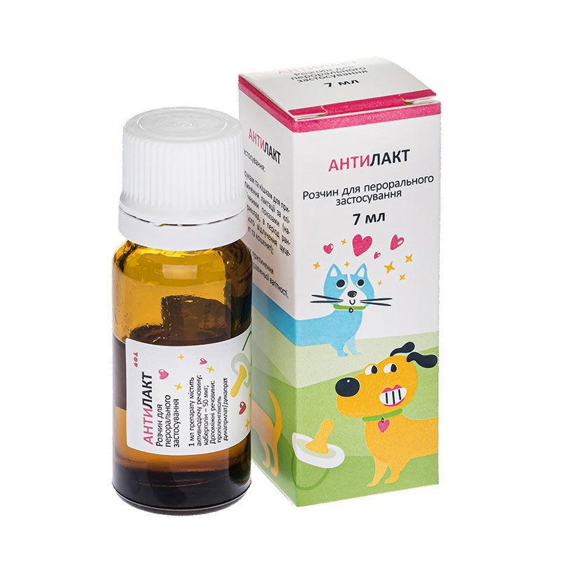 Склад1 мл препарату містить активнодіючу речовину:каберголін 50 мкгДопоміжні речовини: пропіленгліколь, дикаприлатдикапрат.ОписБезбарвний прозорий розчин.Фармакологічні властивостіАТС-VET КЛАСИФІКАЦІЙНИЙ КОД: QG02CB ІНГІБІТОРИ ПРОЛАКТИНУ.Каберголін, що входить до складу препарату, похідне ерголіну, виконує функцію агоніста дофамінових рецепторів, що призводить до гальмування гіпофізом секреції пролактину, основного гормону лактогенезу. Зниження рівня пролактину попереджує лактацію та сприяє зникненню клінічних ознак несправжньої вагітності у сук та кішок.Після перорального застосування пік пригнічення секреції пролактину досягається через 4-8 годин і триває протягом декількох діб, залежно від дози.З організму каберголін виводиться у вигляді метаболітів, в основному з фекаліями (60) та, меншою мірою, з сечею (22).Показання до використанняАНТИЛАКТ застосовують сукам та кішкам для припинення лактації за клінічними показами (наприклад, в період раннього відлучення цуценят та кошенят) та для припинення несправжньої вагітності (псевдовагітності).Спосіб застосування та дозиПрепарат застосовують перорально з кормом або безпосередньо на корінь язика у дозі 0,1 мл (3 краплі, еквівалентно 5 мкг каберголіну на кг м. т.) на 1 кг маси тіла тварини, 1 раз на добу протягом 4-6 діб.ПротипоказанняНе застосовувати у випадку індивідуальної чутливості тварини до каберголіну.Не застосовувати вагітним сукам та кішкам.Не застосовувати лактуючим самкам у період вигодовування потомства.Не застосовувати тваринам з нирковою та печінковою недостатністю.Не застосовувати тваринам у стані гіпотензії.Побічна діяУ рекомендованих дозах переноситься добре. У перші два дні застосування препарату рідко можливі побічні явища у вигляді блювоти, анорексії, летаргії, що припиняються самостійно та не вимагають відміни препарату. У випадку появи нестримної блювоти препарат відміняють.Дуже рідко у тварин, що чутливі до похідних ерголіну, можливі алергічні реакції у вигляді свербежу, набряку, дерматиту та кропивниці, що припиняються після відміни препарату та застосування антигістамінних засобів.ЗастереженняНе застосовувати препарат з антагоністами дофаміну (напр., метоклопрамід), а також з препаратами, що мають гіпотензивну дію.У разі пропуску однієї чи декількох доз препарату лікування слід поновити якомога швидше, у запланованому дозуванні та за схемою застосування.Термін придатності2 роки.Після першого відкриття флакону 28 діб, за умови зберігання його в темному місці за температури від 5 до 25С.Умови зберіганняТемне, недоступне для дітей місце за температури від 5 до 25С.Форма випускуФлакони-крапельниці з темного скла по 7 мл.ДЛЯ ЗАСТОСУВАННЯ У ВЕТЕРИНАРНІЙ МЕДИЦИНІ