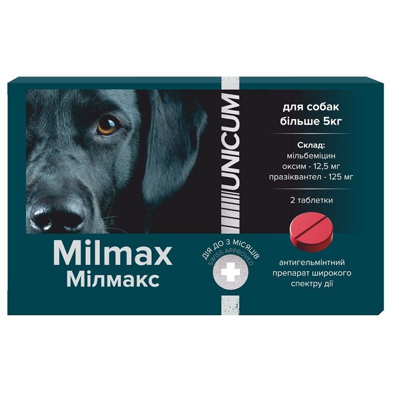 Unicum Milmax антигельмінтні таблетки для собакПризначення:Препарат у вигляді таблеток з мясним смаком застосовується дляпрофілактики та лікування собак від ендопаразитів(нематод, цестод). Активні компоненти забезпечують широкий спектр дії.Показання:Лікування та профілактика при зараженні:Цестоди: Dipylidium caninum, Taenia spp., Echinococcus granulosus, Mesocestoides spp.Нематодитравного тракту: Toxocara cati, Toxocara canis, Toxascaris leonina, Trichuris vulpis, Thelazia callipaeda.Зниження інтенсивності зараження Angiostrongylus vasorum та Crenosoma vulpis.Профілактика дирофіляріозу (Dirofilaria immitis).Лікування та профілактика змішаних нематодо-цестодозних інвазій.Склад 1 таблетки:Діючі речовини: празиквантел 125 мг, мільбеміцин оксим 12,5 мгДопоміжні речовини: целюлоза мікрокристалічна, лактози моногідрат, повідон, натрію кроскармелоза, кремній колоїдний безводний, магнію стеарат, ароматизатор мясний.Переваги:Широкий спектр дії проти ендопаразитів різних видів до 3 місяців.Мільбеміцин оксим макроциклічний лактон, активний щодо личинок та імаго нематод та Dirofilaria immitis.Празиквантел ефективний проти цестод, швидко абсорбується та виводиться з організму.Безпечний для собак різних порід та вікових груп, починаючи з 2 тижнів та вагою від 5 кг.Рекомендації до застосування:Для собак510 кг 1 таблетка.Таблетка приймається добровільно, або з кормом, або примусово на корінь язика після годування.Повторна доза потрібна при втраті частини таблетки.Для дегельмінтизації Angiostrongylus vasorum чотириразово з інтервалом 7 діб для Thelazia callipaeda дворазово з інтервалом 7 діб.Профілактика 1 раз на квартал або частіше для сімей з маленькими дітьми.Для дирофіляріозу весняно-літньо-осінній період, 1 раз на місяць.Запобіжні заходи:Не застосовувати виснаженим та хворим тваринам.Не для цуценят 2 тижнів та 5 кг.Обережно при порушеннях функції нирок і печінки.Використовувати за рекомендацією ветеринарного лікаря для вагітних та годуючих собак.Препарат токсичний для бджіл, риб та інших гідробіонтів.Зберігання:Закрита упаковка, сухе, недоступне для дітей і тварин місце, температура525C.