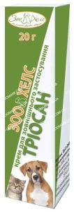 Тріосан крем, 20 гОпис:Крем білого або майже білого кольору.Склад1 г крему містить діючі речовини:дексаметозон - 0,64 мгципрофлоксацин гідрохлорид - 10 мгклотримазол - 10мг.Допоміжні речовини: вода очищена, пропіленгліколь, масло вазелінове, емульгатор, нипагард.Фармакологічна дія:Крем Триосан - комбінований протизапальний, протиалергічний, антибактеріальний, протигрибковий препарат, фармакологічна дія якого зумовлена трьома активними агентами: ципрофлоксацином, дексаметазоном і клотримазолом.Ципрофлоксацин - синтетичний антибактеріальний препарат групи фторхінолонів. За антибактеріальному спектру дії ципрофлоксацин в основному схожий з іншими фторхінолонами: він гальмує активний фермент гіразу, яка бере участь у синтезі ДНК мікробної клітини, в результаті чого настає швидке бактерицидну дію, особливо на мікроорганізми, резистентні до бета-лактамних антибіотиків, тетрациклінів, макролідів і аміноглікозидів.Ципрофлоксацин ефективний проти грамнегативних і грампозитивних мікроорганізмів: Е. coli, Salmonella spp., Campylobacter spp., Haemophilus spp., Pasteurella spp., Bordetella spp., Erysipelothrix rhusiopathiae, Klebsiella spp., Staphylococcus aureus, Streptococcus spp. а також Mycoplasma spp.Дексаметазон має протизапальну, протиалергічну і протисвербіжну дію. Гальмує накопичення лейкоцитів, вивільнення лізосомальних ферментів і протизапальних медіаторів у вогнищі запалення, пригнічує фагоцитоз, зменшує судинно-тканинну проникність, перешкоджаючи утворенню запального набряку.Клотримазол виявляє протигрибкову дію в результаті порушення синтезу ергостерину, який є складовою частиною клітинної мембрани грибів. Активний відносно: Trichophyton rubrum, Trichophyton mentagrophytes, Epidermophyton floccosum, Microsporum canis, Candida albicans, Malassezia furtur.Застосування:Для лікування коней, собак, кішок і хутрових звірів при захворюваннях шкіри алергічної, бактеріальної та грибкової етіології.Дозування:Перед нанесенням крему шерсть на ураженій ділянці вистригають.Крем наносять на уражені ділянки шкіри 2 рази на добу (вранці та ввечері) тонким шаром, обережно втираючи.Тривалість лікування визначається ліквідацією запального процесу та негативними даними бактеріального таабо мікологічного аналізу, припиненням свербежу. При поліпшенні клінічного стану препарат застосовують 1 раз на добу.Курс лікування становить 2-4 тижні (не більше). Між повторними курсами необхідна перерва не менш 20 днів.ПопередженняНе допускати потрапляння препарату в очі та відкриті ранові ділянки.Не допускати злизування препарату тваринами.Побічна дія:При тривалому застосуванні можливі побічні ефекти (пригнічення функції кори надниркових залоз).Протипоказання:Підвищена чутливість до компонентів препарату.Можлива форма випуску:Ламінатні туби по 20 г, 30 г, 50 р.ЗберіганняПри температурі не вище 25С. Не заморожувати.Термін придатності:2 роки.