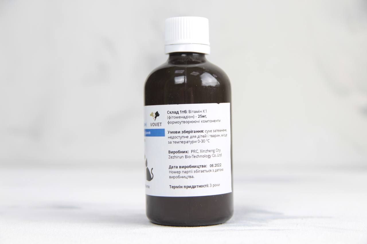 Опис вітамін К1 для собак і кішок VovetПоказання: отруєння антикоагулянтами (після інєкцій К1), вітамін до-гіповітаміноз, фітом поліпшення стану шерсті і шкіриСпосіб застосування та дози: Орально, 1ТБ на 10кг ваги 1 раз на добу, тривалість курсу визначає ветеринарПротипоказання: індивідуальна непереносимість компонентівСклад 1 тб: вітамін К1 ( фітоменадіон) - 25 мг, формотворчі компонентиУмови зберігання: сухе затемнення недоступне для дітей і тварин, міститься при температурі 0-30 CВиробник: PRC, Xinzheng GtyТермін придатності: 3 роки