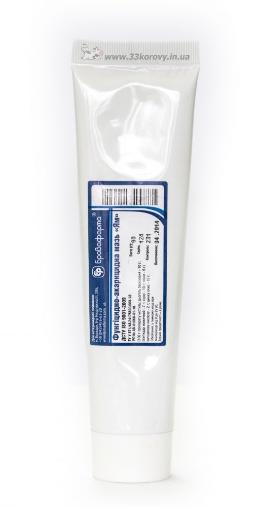 Склад1 г препарату містить:дьоготь березовий 100 мгскипидар живичний 70 мгсірка 100 мгсаліцилова кислота 20 мгокис цинку 100 мглізол 60 мгОписМазь світло-сірого або темно-сірого кольору, кремоподібної консистенції, густа, зі специфічним запахом.Фармакологічні властивостіПрепарат з вираженими фунгіцидними, бактерицидні та ектопаразитарними властивостями.Дьоготь березовий надає антисептичну, протипаразитарну, місцевоподразнюючу, вяжучу та підсушуючу дію.При контакте сери с влагой, щелочами и органическими веществами образуется серний ангидрид, сероводород, кислород и серние щелочи, которие действуют кератопластически и кератолитически, что обусловлено противопаразитарними и противомикробними свойствами сери.Салициловая кислота при местном применении раздражает кожу и способствует отторжению ороговевших клеток епителия. Усиливает грануляцию на поверхности рани, действует бактерицидно, антитоксически, фунгицидно.Окись цинка дает вяжущей, подсушивающей и дезинфицирующий еффект.Лизол обладает противовоспалительним, бактерицидним и инсектицидним действием.ПоказанияЛечение крупного рогатого скота, овец, коз, лошадей, свиней, собак, кроликов, кур при трихофитии, екземах, дерматитах и других заболеваниях кожи, некробактериозе, копитной гнили, саркоптозе (чесотке).ПротивопоказанияНет.Способ применения и дозиПеред применением мазь перемешивают, поскольку при хранении возможно расслоение ее компонентов. Препарат наносят тонким слоем на пораженние участки кожи и на 2-4 см вокруг них и слегка втирают. Предварительно удалять чешуйки и вистригать шерсть не нужно. Пораженние места обрабативают 1-2 раза в сутки до исчезновения чешуек, курс 4-5 дней. Как правило, через 7-10 дней на пораженних участках начинается рост шерсти.После завершения курса лечения проводят контрольное микроскопическое исследование соскобов. При обнаружении возбудителей болезни лечение продолжают.УпаковкаПолімерні туби по 20, 50, 90 г, пластикові контейнери по 250 р.Умови зберіганняВ сухому, темному, недоступному для дітей місці при температурі від 0 до +25 С.Термін придатності2 роки.