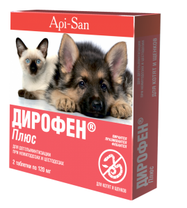 Дирофен плюс для кошенят і цуценят 6 таблетокСкладДирофен таблетки комбінований антигельмінтик для тварин. В 1 г таблеток міститься 50 мг фенбендазола і 15 мг пірантелу памоату, а також допоміжні компоненти. ПоказанняПрофілактика і лікування нематодозів і цестодозов у цуценят і кошенят (включаючи змішані інвазії у тварин).Дози і спосіб застосуванняДирофен таблетки задають тваринам всередину одноразово індивідуально в ранкове годування з невеликою кількістю корму (у шматок ковбаси, мяса, з фаршем або кашею) в дозі 1 таблетка препарату на 1 кг маси тіла. Попередньої голодної дієти і застосування проносних засобів при використанні препарату не потрібно. З профілактичною метою дегельмінтизацію проводять раз на 3 місяці, а також перед кожною вакцинацією. Лікувальні заходи проти нематод і цестод проводять за показаннями. При сильному ступені інвазії Дирофен таблетки можна застосувати повторно через 10 днів.