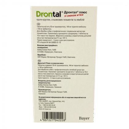 Опис Дронтал плюсСовременнийпротивогельминтнийпрепарат Дронталплюс, купить которий можно в нашеминтернет-магазине - ето еффективное средство для леченияинвазий, визванних глистами различних типов. В состав препарата включени сразу три действующих компонента -ембонатпирантела,празиквантелифебантел. Действуя совместно, они уничтожают гельминтов на всех стадиях, начиная от яиц и заканчивая сформировавшимися особями. При етом, препарат не оказивает негативного действия на организм животного, не визиваеталлергийлибо побочних еффектов. Легке передозування також не завдає ніякої істотної шкоди здоровю. Саме тому застосування Дронтала - це найкращий спосіб провести швидку дегельмінтизацію ваших вихованців як в лікувальних цілях, так для профілактики. Ліки ефективно проти цілого ряду гельмінтів - круглих, стрічкових і плоских (у тому числі Toxacara canis, Echinococcus multilocularis, Uncinaria stenocephala, Dipylidium canynum, Multiceps multiceps, Taenia sp., Mesocestoides sp. і багатьох інших). Показання до використання ДронталаЗаболевания, визванние гельминтами -цестози,токсокарози, аскаридози, трематодози, заражение ленточними червями типа цепней и другие.Инструкция по применениюПрепарат можно применять для собак возрастом более 4-х недель. 1 таблеткаДронталарассчитана на 10 кг веса. Из етого и надо исходить, рассчитивая нужную дозу препарата (минимальное количество для животних от 2 до 5 кг - 12 таблетки, разделять ее на меньшие части не следует). Для лечения, а также в качестве профилактической мери достаточно 1 приема. В год следует проводить не менее 4 приемов (не ранее, чем за две недели довакцинаций). ПротипоказанняЗрідка можливе підвищення температури, блювота і пронос - це нормальна реакція при великій кількості глистів в організмі. Не застосовувати препарат для лікування вагітних тварин.
