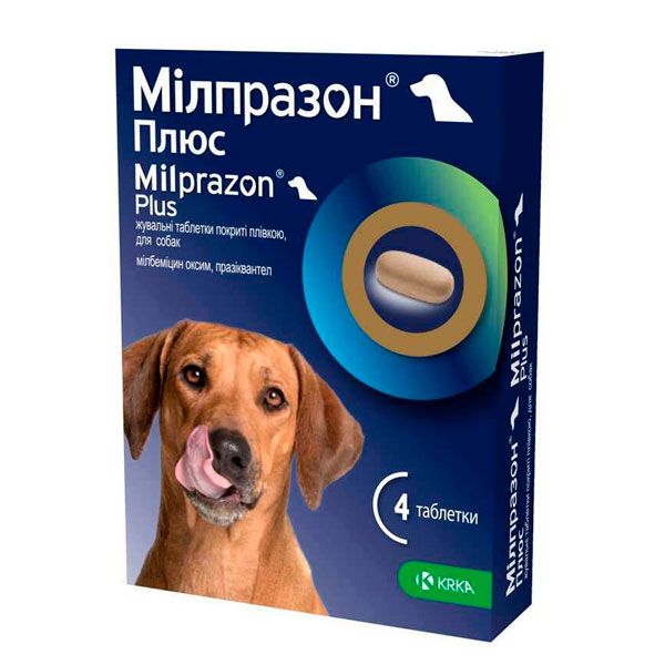 Milprazon Plus це новий антигельмінтний препарат від компанії KRKA, унікальність якого полягає в його натуральній формулі.Згідно з дослідженнями, проведеними відповідно до керівництва EMA, понад 85 собак із задоволенням зїдають жувальну таблетку Мілпразон Плюс завдяки її привабливому смаку та ідеальному розміру.Натуральний смак печінки та мяса подобається більшості чотирилапих друзів, а овальна форма таблетки зручна для прийому.З новими жувальними таблетками дегельмінтизація вихованця пройде легко й приємноЗавдяки комбінованому складу препарат має широкий спектр дії та ефективний проти дорослих круглих, стрічкових, легеневих, очних і серцевих глистів, а також їхніх личинок.Мілбеміцину оксим, що входить до складу таблеток, активний проти личинок та іміаго нематод, а празиквантел проти цестод і трематод.Переваги Milprazon Plus для собак:Покращені смакові якості натуральний смак печінки, смак мяса та дріжджі.Невеликий розмір та овальна форма полегшують прийом таблетки.Широкий спектр дії проти найпоширеніших гельмінтів, включно з круглими та стрічковими, а також личинками дирофілярій.Використовується як для профілактики, так і для лікування глистової інвазії.Разове дозування достатньо дати одну таблетку на місяць.Не потребує попередньої голодної дієти або застосування проносних засобів.Підходить для цуценят віком від 2-тижнів і вагою від 0,5 кг.Дозволений до застосування вагітним та годуючим тваринам під наглядом ветлікаря.Показання до застосування:Для профілактики та лікування гельмінтозів, спричинених як дорослими особинами, так і личинками цестод - (Dipylidium caninum, Taenia spp., Echinococcus spp, Mesocestoides spp.), нематод - (Ancylostoma caninum, Toxocara leonina, Trichuris vulpis, Thelazia callipaeda) знижує інтенсивність зараження (Angiostongylus vasorum, Crenosoma vulpis), зокрема комбінованих нематодо-цетодних інвазій.Препарат підходить також для профілактики дирофіляріозу (Dirofilaria spp.).Протипоказання:Підвищена індивідуальна чутливість до діючих речовин препарату (у т.ч. в анамнезі).Явні порушення функції нирок і печінки.Не застосовувати цуценятам молодше 2-тижневого віку та вагою менше 0,5 кгНе застосовувати виснаженим та хворим на інфекційні захворювання тваринам