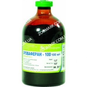 Опис препарату Броваферан 100Ветеринарний препарат Броваферан 100 розроблений компанією Бровафарма (Україна). Являє собою зєднання низькомолекулярного декстрину і гідроокису заліза. Препарат випускається у вигляді темно-бурого розчину для інєкцій, упакований у флакони з коричневого скла. В 10 мл міститься 10 мг тривалентного заліза.Засіб підвищує рівень гемоглобіну, збільшує еритроцити крові, заповнює в організмі тварин недолік заліза, активізує кровотворну систему. Броваферан100 назначают домашним животним в качестве терапии и профилактики железодефицитной анемии (малокровия), при латентном дефиците в организме железа (при неполноценном питании, в период лактации и беременности), для лучшей сохранности молодняка, особенно телят и поросят.Инструкция по применениюСогласно инструкции делают внутримишечную инъекцию, вводя иглу глубоко в мишцу в районе шеи или бедра. Препарат перед применением следует обязательно нагреть до температури тела животного.Для профилактики анемии назначают 10 мл препарата свиноматкам за месяц до опороса. Молодняку свиней, овец и коров в етих же целях делают разовие инъекции Броваферана100 в возрасте 3-6 суток. Поросятам достаточно 1,5-2 мл, ягнятам вводят 2-3 мл, телята получают 8-10 мл препарата.Если в хозяйстве обнаружени животние с признаками малокровия, то в лечебних целях вводятБроваферан100 в таких же дозах еженедельно в течение месяца.После уколаБроваферанав месте его введения может появиться небольшой отек, которий проходит самостоятельно в течение нескольких дней.Залізовмісні засоби не можна застосовувати у випадках гострого авітамінозу токоферолу (вітаміну Е) і нестачі в кормах мікроелемента селену.Засіб слід зберігати при кімнатній температурі. Замерзання препарату неприпустимо. Броваферан 100 придатний до 3 років. Відкритий флакон слід використати протягом доби.