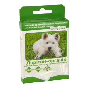 ЛОРИТОН витамини для улучшения роста и развития щенков, 50 табл. зелениеВитамини и минеральние вещества участвуют в обмене веществ самостоятельно или в составе ферментов и необходими для обеспечения нормального функционирования организма. Витамини не образуются в организме собак или образуются, но в недостаточном количестве. Поетому их относят к незаменимим пищевим веществам.Витаминно-минеральний комплекс ЛОРИТОН-органик для улучшения роста и развития щенков содержит витамини А, Д, Е и группи В, биотин, железо, цинк, марганец, калий, кобальт, йод, кальций, фосфор. Застосовують для поліпшення росту і розвитку організму і підвищення імунітету цуценят (починаючи з 4-х тижневого віку). Рекомендуетсья давати цуценятам для правильного формування зубів і кісток, профілактики рахіту, поліпшення фізичного стану і нормального перебігу поетапного фізіологічного розвитку.