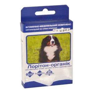 ЛОРИТОН вітаміни для зміцнення мязів і суглобів для старіючих собак, 50 таблеток.Вітаміни та мінеральні речовини беруть участь в обміні речовин самостійно або в складі ферментів та необхідні для забезпечення нормального функціонування організму. Вітаміни не утворюються в організмі собак або утворюються, але в недостатній кількості. Тому їх відносять до незамінних харчових речовин.Вітамінно-мінеральний комплекс ЛОРИТОН-органік для зміцнення мязів, суглобів і для старіючих собак містить вітаміни А, Д, Е і групи В, біотин, лізин, метіонін, залізо, цинк, марганець, магній, калій, кальцій, фосфор, хондроїтин натрію сульфат, гідролізат колагену. Хондроітин натрію сульфат бере участь у побудові основної речовини кісткової та хрящової тканин, нормалізує фосфорно-кальцієвий обмін, перешкоджає розвитку дегенеративних змін хрящової тканини, стимулює регенерацію сполучної тканини. Гідролізат колагену зміцнює звязки і суглоби, підвищує пружність шкіри, забезпечує міцність і еластичність хрящів і стінок судин.