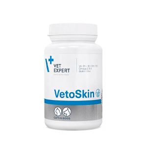 Vet Expert VetoSkin (Вет Експерт ВетоСкін) харчова добавка для котів і собак для підтримання здоровя шкіри та якості шерсті.Баланс омега жирних кислот забезпечує всіма необхідними речовинами для покращення функції шкіри.Показання:для котів і собак із сухою та тьмяною шерстюпри випадінні шерстіпри лупіПереваги:Містить олію лікарського огірочника як натуральне джерело незамінних жирних кислот омега-6, що підтримують барєрні функції шкіри тварини.Завдяки наявності у складі рибячого жиру, багатого на жирні кислоти омега-3, препарат має протизапальну та протинабрякову дію, а також сприяє еластичності клітинних мембран.Включає до себе лінолеву та гамма-ліноленову кислоти, що запобігають втраті вологи шкірою, завдяки чому вона залишається зволоженою та еластичною.З додаванням цинку, що прискорює лікування дерматологічних захворювань, а також сприяє регенерації.Збагачений вітамінами В1, В2, В6 і В12, що підсилюють захисні функції шкіри та відіграють найважливішу роль у метаболізмі ненасичених жирних кислот.Містить біотин, що сприяє зменшенню виділень сальними залозами, що особливо корисно для собак, які страждають на себорею та лупу.Під час застосування дозволяє зменшити кількість протизапальних препаратів (у тому числі стероїдів), що широко використовуються у протисвербіжній терапії.Можна використовувати також для профілактики порушень стану шкіри та шерсті.Капсула Twist-off (твіст-офф) забезпечує тривале збереження якості вмісту препарату та полегшує прийом твариною.