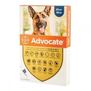 Засіб для лікування і профілактики Advocate Bayer використовується для лікування отодектозу, хейлетіоза, демодекозу, сркоптоза, а також для лікування і профілактики зараження блохами, профілактики нематодозів, Uncinaria stenocephala, Toxocara canis, Ancylostoma caninum, Oxascaris leonina, Trichuris vulpis, алергічного блошиного дерматиту.Адвокат. Інструкція по застосуванню.Дозування препарату Advocate Bayer згідно таблиці:Вагатварини (кг)Розмір піпеткиОбсяг,(мл)Імідаклоприд,(мгкг ваги)Моксідектин(мгкг ваги) 4 - 10 кгАдвокат для середніх собак1,010-252,5-6,25 10 25 кгАдвокат для великих собак2,510-252,5-6,25 25 40 кгАдвокат для дуже великих собак4,010-162,5-4 40 кгВідповідна комбінація піпетокДля профілактики зараження блохами, а також для лікування блошиного дерматиту, необхідна одна обробка в місяць.Отодектоз виліковується однією обробкою. Перед процедурою необхідно видалити скоринки із зовнішнього вуха, а під час обробки не допускати потрапляння препарату в канал вуха. У випадку, якщо симптоми не проходять протягом місяця, необхідно звернутися до ветеринара.Лікування саркоптоз проводиться дворазовим застосуванням препарату Байєр Адвокат з інтервалом 1 місяць.Демодекоз виліковується після 2-4 обробок з місячним інтервалом.Профілактику дирофіляріозу слід починати за місяць до можливого появи комарів і продовжувати 2 місяці після закінчення їх активності з періодом обробки в 1 місяць.Використання Advocate Bayer знижує можливість реінвазії нематодами, анкілостомами і цестодами. Можливе застосування в якості сезонної профілактики гельмінтозів та бліх.Спосіб застосування препаратуПрепарат Advocate Bayer наноситься на здорову шкіру між лопаток собаки. Якщо вага собаки не перевищує 25 кг, то необхідно видавити весь вміст в цю область. Якщо собака велика, нанесіть препарат уздовж хребта в 3-4 точках, закінчуючи коренем хвоста. Не варто видавлювати велика кількість препарату в одну точку, щоб уникнути його стікання.Протипоказання до застосування стосуються цуценят віком до 7 тижнів та вагою менше 1 кг Для лікування хворих тварин необхідна консультація ветеринара.Для вагітних і лактуючих самок протипоказань немає.Слід уникати використання інших макроциклічних лактонів.Не допускайте попадання собаки у відкриті водойми протягом 4 днів після застосування препарату. Використання шампунів дещо знижує ефективність дії препарату.Умови зберігання: зберігати при температурі не вище 30 С.Піпетки з препаратом упаковані в блістери по 3 штуки.