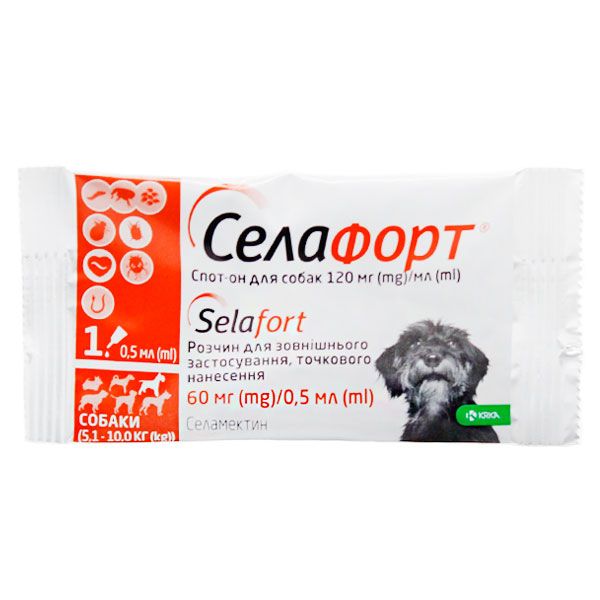 Селафорт відноситься до протипаразитарний лікарських препаратів групи макроциклічних лактонів.Діюча речовина препарату - селамектин володіє широким спектром системного нематодоцидного, інсектицидної і акарицидної дії, активний проти нематод, комах і саркоптоидних кліщів, що паразитують у собак і кішок, володіючи ларвицидними і овоцидними властивостями, перериває цикл розвитку комах. Фармакокінетичні властивості препарату забезпечують хороше всмоктування селамектина з місця нанесення, тривале підтримання терапевтичних концентрацій в органах і тканинах тварини, що забезпечує знищення паразитів і захист тварин від реінвазії протягом місяця. Механізм дії селамектина полягає в його здатності звязуватися з рецепторами клітин (мязової і нервової тканини) паразитів, підвищувати проникність мембран для іонів хлору, що викликає блокаду провідності нервових і мязових клітин у нематод, комах, кліщів і призводить до паралічу і загибелі паразитів. Враховуючи, що у ссавців рецептори, чутливі до селамектину, локалізовані тільки в центральній нервовій системі, а селамектин не проникає через гематоенцефалічний барєр, отруєння собак і кішок малоймовірно.Селафорт за ступенем впливу на організм відноситься до помірно небезпечних речовин (3 клас небезпеки по ГОСТ 12.1.007-76), у рекомендованих дозах не виявляє місцево-подразнювальну, резорбтивно-токсичним і сенсибілізірующим дією, добре переноситься кішками і собаками різних порід, включаючи коллі та споріднені породи собак. Препарат токсичний для бджіл, а також для риб та інших гідробіонтів.ПОКАЗАНИЯСелафорт призначають собакам і кішкам з лікувальною і профілактичною метою при ентомозах, викликаних блохами, вошами і волосоїдів, отодектозе, саркоптоз, анкилостомозе і токсокарозе, а також для профілактики дирофіляріозу.ПРОТИВОПОКАЗАНИЯПротивопоказанием до застосування є підвищена індивідуальна чутливість тварини до компонентів препарату (у тому числі і в анамнезі). Селафорт не слід наносити на вологе або пошкоджену шкіру.Вагітним і лактуючим самкам при необхідності Селафорт застосовують після консультації з ветеринарним лікарем. Селафорт не слід застосовувати цуценят і кошенят віком до 6-тижневого віку.СоставСелафорт у формі 6 і 12 розчину в якості діючої речовини містить селамектин відповідно 60 мг мл і 120 мг мл допоміжні речовини: ізопропіловий спирт, бутилгидрокситолуол, диметилсульфоксид.За зовнішнім виглядом препарат являє собою прозорий розчин від безбарвного до жовтого кольору, або від безбарвного до коричневого, або від безбарвного до коричнево-жовтого, или от бесцветного до желто-зеленого цвета.Селафорт випускают расфасованним в полимерние пипетки разного объема с колпачками различного цвета - Селафорт 6 раствор по: 0,25 мл (розовий колпачок), 0,75 мл (бирюзовий колпачок), 1 мл (серо-коричневий колпачок) Селафорт 12 раствор по: 0,25 мл (фиолетовий колпачок), 0,5 мл (оранжевий колпачок), 1 мл (красний колпачок), 2 мл (зелений колпачок), 3,0 мл (темно-синий колпачок).Пипетки упаковивают по 1 штуке в блистер, которий помещают вместе с инструкцией по применению в картонние коробки. Колір коробки і ковпачків піпеток в цій коробці однакові.Відпускається без рецепта ветеринарного лікаря.РекомендацииСелафорт застосовують собакам і кішкам шляхом одноразового нанесення на суху, неушкодже