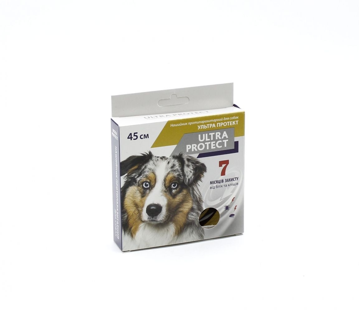 Ultra Protect нашийник для собак інсектоакарицидний препарат, призначений для знищення бліх та іксодових кліщів, що паразитують на собаках, а також для захисту від повторного зараження.Діючі речовини:пропоксур, флуметрин (10 г нашийника містять 0,83 г пропоксура та 0,245 г флуметрина).Опис:Нашийник являє собою полімерну стрічку довжиною35 смз петлями для фіксації. Випускається убілому, червоному або синьому кольорі.Показання:Профілактика та лікування собак при ураженні ектопаразитами:блохи (Ctenocephalides canis)іксодові кліщі (Rhipicephalus sanguineus,Ixodes ricinus).Застосування:Один нашийник призначенийдля однієї тварини.Відкрийте упаковку, розгорніть нашийник і закріпіть вільно навколо шиї собаки так, щоб між шиєю та нашийником залишався проміжок у два пальці.Нашийник не повинен здавлювати шию або заважати росту тварини.Постійне використання забезпечуєзахист до 7 місяців.При зниженні ефективності нашийник необхідно замінити.Перед купанням нашийник бажано знімати, оскільки надмірне зволоження знижує його дію.Протипоказання:Не застосовувати разом з іншими інсектицидними засобами.Не використовувати у хворих або ослаблених тварин.При появі подразнення шкіри зняти нашийник і звернутися до ветеринарного лікаря.Умови зберігання:Зберігати у закритій упаковці, у сухому місці, недоступному для дітей і тварин, окремо від кормів і продуктів харчування, при температурі від0 до +25C.Термін придатності:у закритій упаковці 5 років,після розкриття 6 місяців.