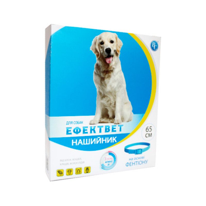 Эффектвет нашийник протипаразитарний для собак, 65смОпис:Полімерна стрічка з пряжкою блакитного кольору зі специфічним запахом складових компонентів.Склад:Стрічка полівінілхлоридна містить діючу речовину:фентіон-0,5-0,7 г.Фармакологічні властивості:ATCvet QP53А, ектопаразициди для місцевого застосування з інсектицидами (QP53AF07)Фентіон-інсектицид групи тіофосфорорганічних сполук, механізм дії полягає в блокуванні ферменту ацетилхолінестерази в синапсах ЦНС паразита, що призводить до його загибелі. Фентіон погано проникає через гематоенцефалічний барєр теплокровних тварин, але при зовнішньому застосуванні всмоктується через шкіру і проникає в кров. Кровоссальні паразити гинуть через потрапляння в їх організм фентіона з кровю тварин.Діюча речовина, яка входить до складу нашийника, поступово виділяється з поверхні стрічки на шерсть тварини, проявляючи свою ектопаразитарну дію.Застосування:Профілактика і лікування собак при ураженні ектопаразитами: блохами (Ctenocephalides felis), вошами (Linognathides spp.), кліщами (Demodex canis, D. felis, Otodectes cynotis), волосоїдами (Ttrichodectes canis), чутливими до фентіону.Дозування:Нашийник виймають з упаковки і одягають на шию тварини, фіксують таким чином, щоб між шиєю і нашийником залишався невеликий проміжок 1-2 см, потім закріплюють пряжкою і обрізають надлишок стрічки. Довжина нашийника регулюється в залежності від розміру тварини. Підігнаний належним чином нашийник в закріпленому стані повинен вільно рухатися.Постійне використання нашийника забезпечує захист тварини від ектопаразитів протягом 6 місяців.Протипоказання:Не застосовувати цуценятам до 4-х місячного віку.Не застосовувати ослабленим і хворим тваринам і тваринам з підвищеною індивідуальною чутливістю до фентіонуНе застосовувати тваринам під час вагітності та лактаціїЗастереження:При роботі з препаратом дотримуватися основних правил гігієни і безпеки, прийняті при роботі з ветеринарними препаратами.Упаковку з нашийником відкривати безпосередньо перед застосуванням. Маніпуляції з нашийником проводити в захисних гумових рукавичках, після маніпуляцій слід ретельно вимити руки теплою водою з милом вимити і просушити рукавички. Уникати контакту маленьких дітей з тваринами, у яких є нашийники.Зберігання:Зберігають нашийник в захищеному від світла місці при температурі від 5 до +25з, в місцях, недоступних для дітей і тварин, окремо від харчових продуктів.Термін придатності:2 роки.