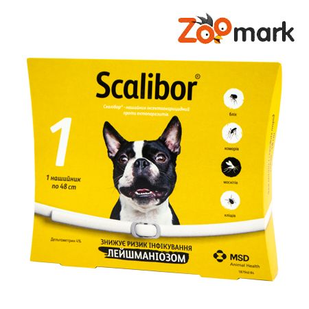 Скалибор - це інсектоакарицидний нашийник для собак, запобігає ураження кліщами, блохами, укуси москітів (Phlebotomus perniciosus) і комара звичайного (Culex pipiens), одночасно надійно захищає тварину від захворювань, які переносяться зазначеними комахами: бабезіозу, бореліозу, дирофіляріозу, ерліхіозу, енцефаліту і лейшманіозу.Діюча речовинаДіючою речовиною кошти від кліщів для собак Скалибор є дельтаметрин.Він відноситься до группепиретроидов, мають моментальний відлякуючий (репеллентний) ефект у відношенні кліщів, бліх, а також швидке умерщвляющее (інсектициднуакаріцидниє) дію на всіх паразитів.Діюча речовина рівномірно розподіляється в ліпідному шарі шкіри собаки і вже до початку другого тижня дію Скалибор досягає повної ефективності.Якщо Ви не знаєте як захистити собак від комарів, спробуйте використовувати инсектоакарицидное засіб Скалибор. З його застосуванням захист собак від бліх, кліщів, комарів триває до 6 місяців.СвідченняПрофілактика і лікування собак при ураженні блохами, кліщами, вошами, волосоїдів, комарами і кліщами. Нашийник Скалиборзахищає собаку від нападів ектопаразитів, особливо в теплу пору року.Безперервне використання нашийника забезпечує захист тварин від іксодових кліщів і комарів протягом 6-ти місяців, москітів - протягом 5-6 місяців, від бліх і волосоїдів - протягом 4 місяців.Максимальний захисний ефект досягається через тиждень після початку використання нашийника.Скалибор інсекто-акарицидні нашийник може застосовуватися вагітним і годуючим сукам.Захисні ефектиРепеллентний ефект. Під репеллентним ефектом розуміється лякливо дію певних хімічних препаратів на комарів, кліщів і бліх, атакуючих собаку. Навіть короткий взаємодія комах сдельтаметрином викликає подразнення нервових закінчень їх кінцівок - так званий ефект гарячих ніг, який змушує паразитів негайно покинути тіло собаки.Нокдаун-ефект. Навіть мінімальний контакт бліх та інших паразитів з дельтаметрином призводить до порушення їх рухової координації з розвитком паралічу, після чого паразит відпадає сам або гине.Ефект блокування живлення анти-укус. Паралізований паразит не здатний присмоктатися до тваринного або затриматися на ньому. Таким чином, виключається можливість зараження собаки захворюваннями, переносяться кліщами та іншими комахами (бореліоз, ерлихиоз, енцефаліт, пироплазмоз та інші).Застосування инсектоакарицидного нашийникаТільки правильно зафіксований нашийник від кліщів для собакгарантує тривале і ефективне виділення чинного захисної речовини.Мета забезпечити максимально можливу площу контакту з поверхнею шиї собаки протягом усього часу використання.Такой еффект достигается в том случае, если между шеей собаки и ошейником помещаются два пальца.Свободний конец укорачивается до 5 см, таким образом можно легко подобрать необходимую длину под окружность шеи растущих собак.В течение первих 5 дней применения средства от комаров для собак следует воздержаться от купания животного, чтоби позволить действующему препарату равномерно распределиться по всей поверхности кожи. После надевания ошейника вимойте руки теплой водой с милом.ПреимуществаШирокий спектр дії. Скалибор (Scalibor Protector Band)активно діє проти бліх, кліщів, комарів, москітів. Вже при малих початкових концентраціях дельтаметрина препарат максимально ефе
