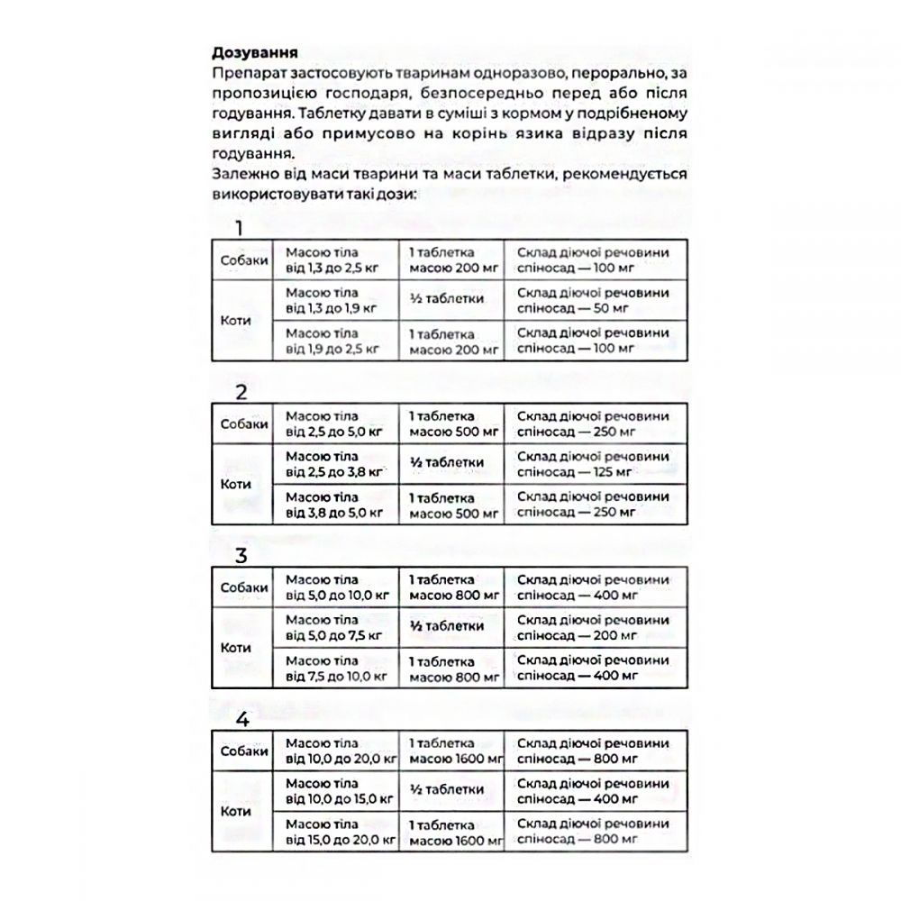 Superium Spinosad Таблетки для собак і кішокЕктопаразити становлять небезпеку не тільки для тварин, але і для людей, так як є переносниками різного роду інфекцій. Небезпека зараження існує цілий рік, адже личинки можуть потрапити в організм тварини не тільки на вулиці, а й в квартирі, куди потрапляють з взуття або предметів, які були на вулиці.Особливістю препарату є те, що його можна давати молодим тваринам малої ваги.Протипаразитарний засіб природного походження, його виділяють з бактерій Saccharopolyspora spinosa, що живуть в цукровій тростині. Речовина ефективно проти більш ніж 20 видів ектопаразитів (бліх і їх личинок, підшкірних кліщів, волосоїдів) також допомагає загоєнню ран, знімає роздратування шкіри.Ще одна унікальність спиносада-відсутність звикання у паразитів.Таблетки пахнуть яловичиною, що значно полегшує прийом препарату.Переваги та особливості:Безпечний препарат природного походження. Спіносад 100 натуральний препарат (видобувається з бактерій Saccharopolyspora spinosa), на відміну від хімічно синтезованих препаратівПерша в Україні таблетка від бліх для кішок і собакПочинає знищувати бліх через 30 хвилинДіюча речовина (Спіносад) завдяки своєму натуральному походженню не має побічних ефектів (при правильному дозуванні), що дозволяє використовувати таблетку для захисту самих маленьких вихованців-кішок і цуценятSuperium Spinosad не викликає звикання і адаптації до діючої речовини у паразитівПігулка діє на бліх і їх личинок, волосоїдів, а також більш ніж на 20 різновидів інших ектопаразитівSuperium Spinosad приймається разом з їжею і починає діяти вже через 30 хвилин. Завдяки сорбентів в складі таблетки, препарат швидко виводить токсини паразитів з організму і вирішує головні проблеми - прибирає свербіж, а також лікує рани від укусів і дерматитДіюча речовина швидко виводиться з організму тварини і затримується в сальних залозах протягом 30 діб, де діє на бліх та інших ектопаразитів, які знаходяться зовні вихованцяПеред застосуванням препарату проконсультуйтеся з ветеринаром і ознайомтеся з інструкцією, наведеною нижчеІнструкція:Superium Spinosad-це перша таблетка натурального походження від бліх для кішок і собак.Опис:Таблетки світло-сірого кольору, круглої форми зі специфічним запахом складових компонентів.Фармакологічні властивості:Аtcvet QP53BX, інші ектопаразитициди для системного застосування (QP53BX03, спіносад)Діюча речовина спіносад-інсектицид з класу спінозинів, які є не антибактеріальними тетрациклічними макролідами. Спіносад містить два основні фактори-спінозин А і спінозин D, що продукуються природними бактеріями Saccharopolyspora spinosa.Спіносад, що входить до складу препарату, активний відносно комах-ектопаразитів:Ctenocephalidesfelis (котяча блоха)Ctenocephalidescanis (собача блоха)Pulex irritans (людська блоха)Xenopsylla cheopis (щуряча блоха)Altica lythri (земляна блоха)Діюча речовина спіносад, знижує кількість бліх і вираженість атопічного блошиного дерматиту у котів і собак. Щомісячне пероральне призначення спіносаду є практичним способом лікування інфестації блохами і алергічного блошиного дерматиту у котів і собак. Штучний ароматизатор зі смаком яловичини сприяє кращому поїданню тваринами лікарського препарату. Ентеросорбент представлений мікро-кристалічною целюлозою, гідроксипропілцелюлозою і колоїдним кремнієвим ангідридом. Сорбенти беруть участь у виведенні токсинів та інш