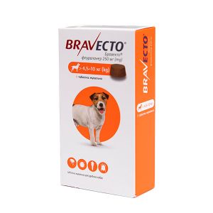 Опис жувальної таблетки для собак БравектоБравекто (таблетка) забезпечують широкий спектр дії і мають довготривалий захист, знищуючи бліх протягом 2-х годин і контролюючи поява кліщів.Бравекто для собак не тільки усуває вже існуючих бліх, але й запобігає появі нових.Якщо ви вирішили купити Бравекто, то отримаєте наступні переваги:Одна доза Bravecto сприяє ефективному захисту від кліщів і бліх, забезпечуючи профілактику і лікування терміном до 12 тижнівДля захисту на повний рік потрібно купити всього 4 дози Бравекто. Ціна звичайно вище, ніж у звичайних препаратів, але зате не потрібно щомісячне використання.Відсутні побічні явища, не потрібна ізоляція інших домашніх тварин у період лікування БравектоЗавдяки тривалій дії, зменшується ймовірність повторного зараження між періодами в лікуванніМає приємний аромат і смак, тому охоче зїдаються собакамиДія Bravecto:Препарат мгновенно насищает кожу собаки и имеет бистрое воздействие на паразитов. Эффективно убивает блох, предотвращая повторное появление и уничтожает клещей, а так же их личинокПредостережения:Хранить в оригинальной упаковке, в недоступном для детей месте.Тщательно вимить руки с милом сразу после использования.Показания к применению:Бравекто назначают взрослим собакам и щенкам старше 6 месяцев для лечения и профилактики от блох, клещей, а так же их личинок . Безопасен для применения на беременних и кормящих самках.Способ применения:Бравекто застосовують перорально, у вигляді разової дози, кожні 12 тижнів, у відповідності з графіком дозування і масою тіла. Лікування препаратом не залежить від погодних явищ і може тривати цілий рік без перервиУмови зберігання:Bravecto слід зберігати в закритій упаковці, при температурі нижче 30 CЦіни на БравектоБравекто в таблеткахЦіна2-4,5 кг575 грн4,5-10 кг615 грн10-20 кг648 грн20-40 кг701 грн40-56 кг775 грн